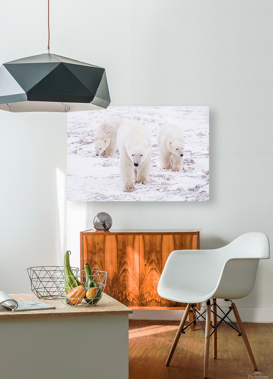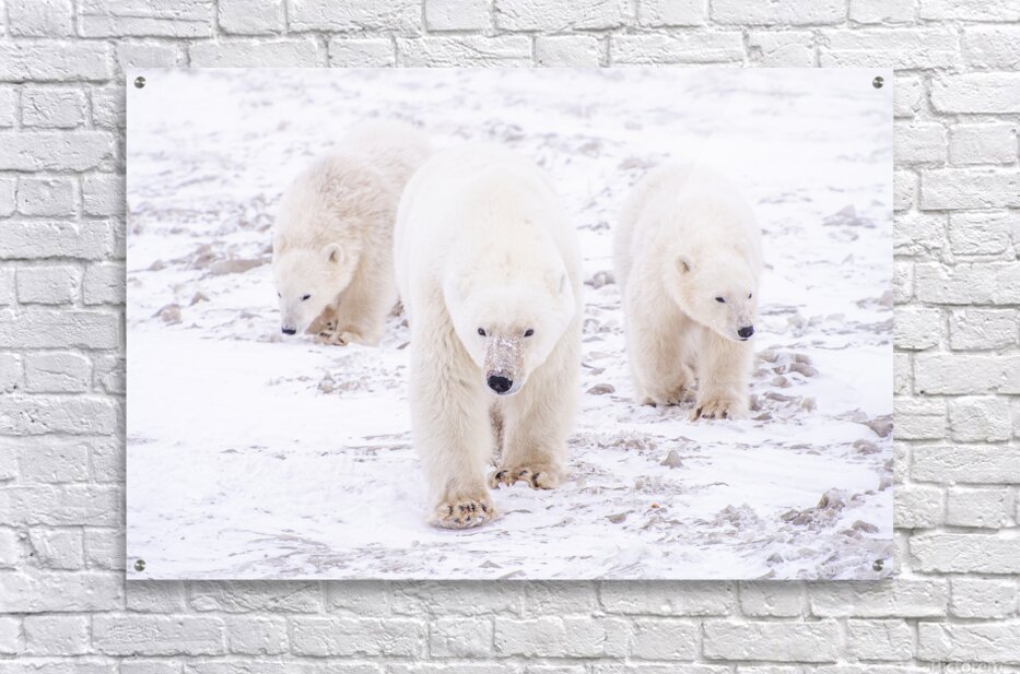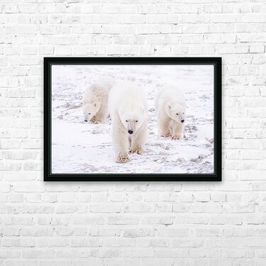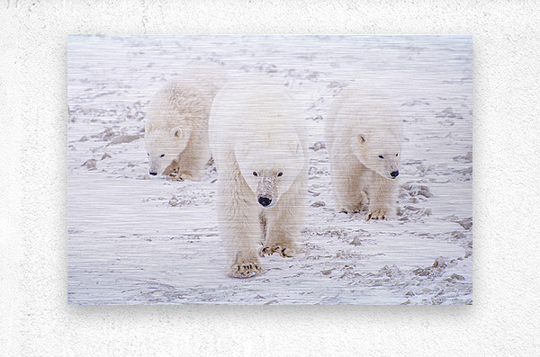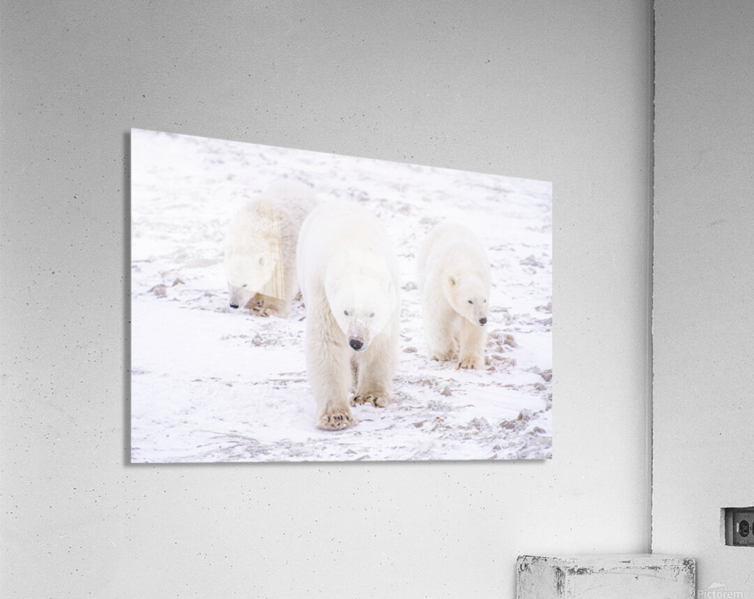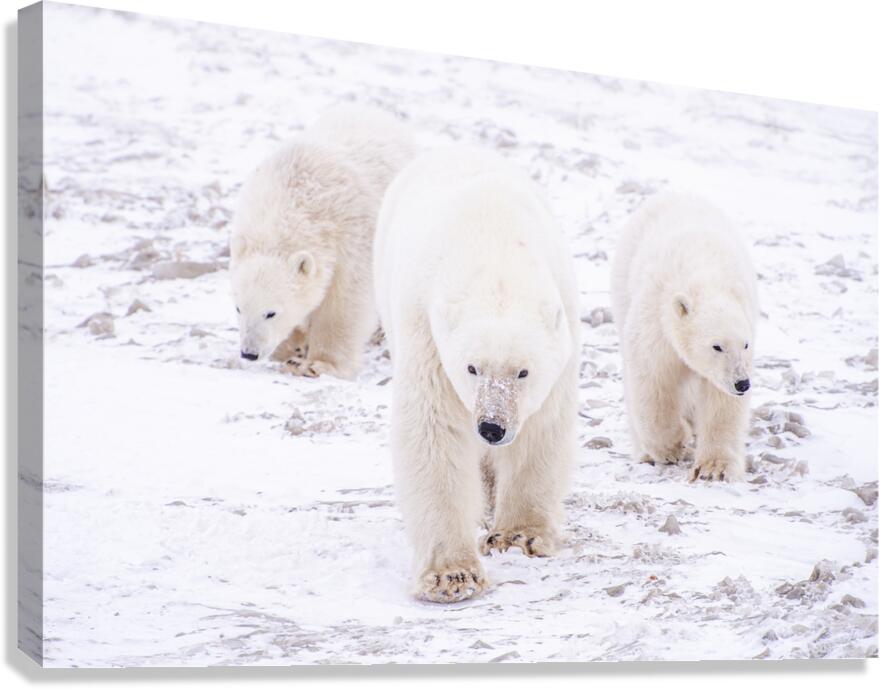 A mother polar bear and her two cubs of the year 11 months trek their way across a jagged and icy landscape. Keeping close to their mom will increase their odds of staying safe in the harsh arctic environment. Churchill Wildlife Management Area Manitoba Canada